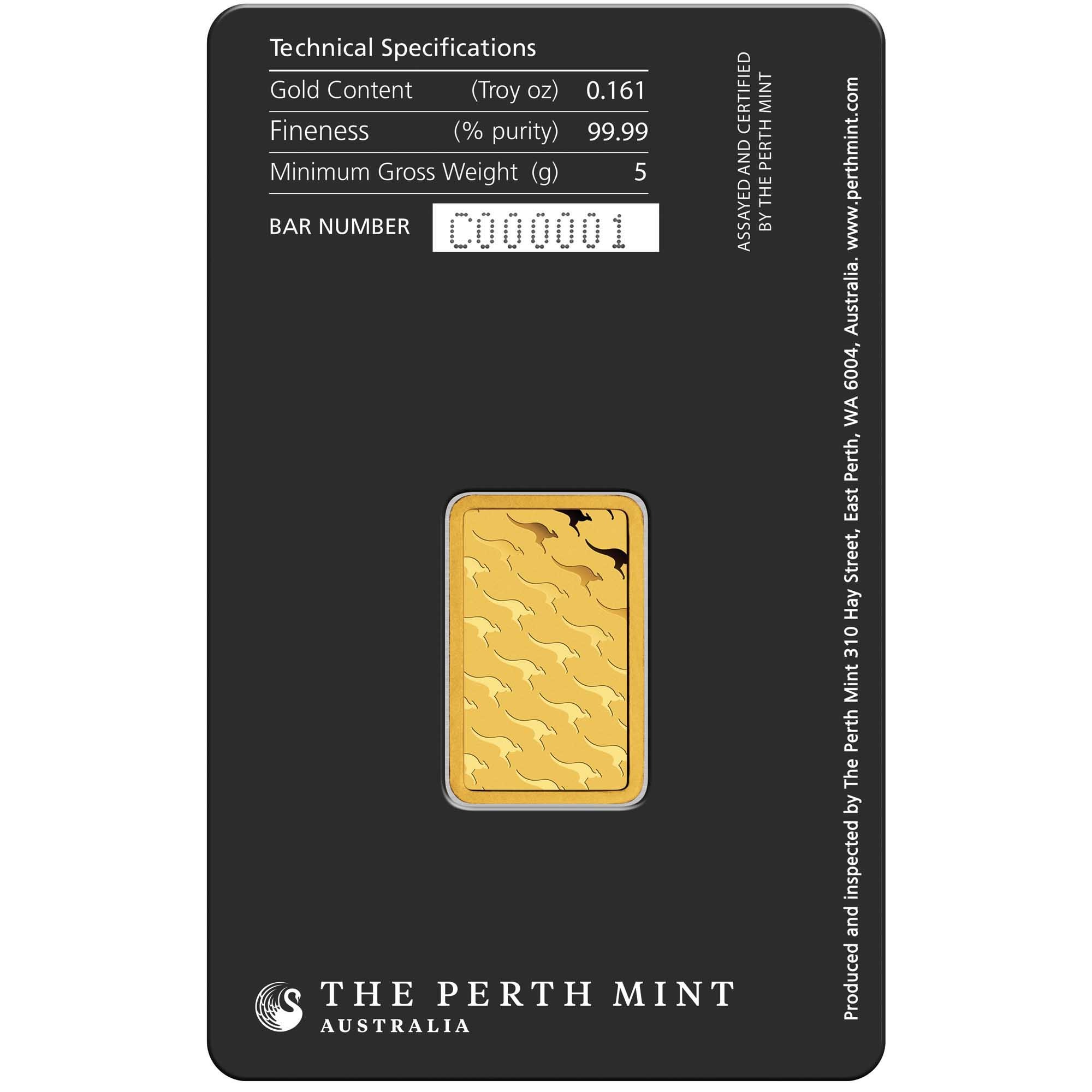 La barra de oro acuñada de 5g es uno de los ocho tamaños disponibles, todos con el logotipo internacionalmente reconocido del ‘cisne’ de The Perth Mint en el anverso y motivos estilizados de canguro en el reverso.