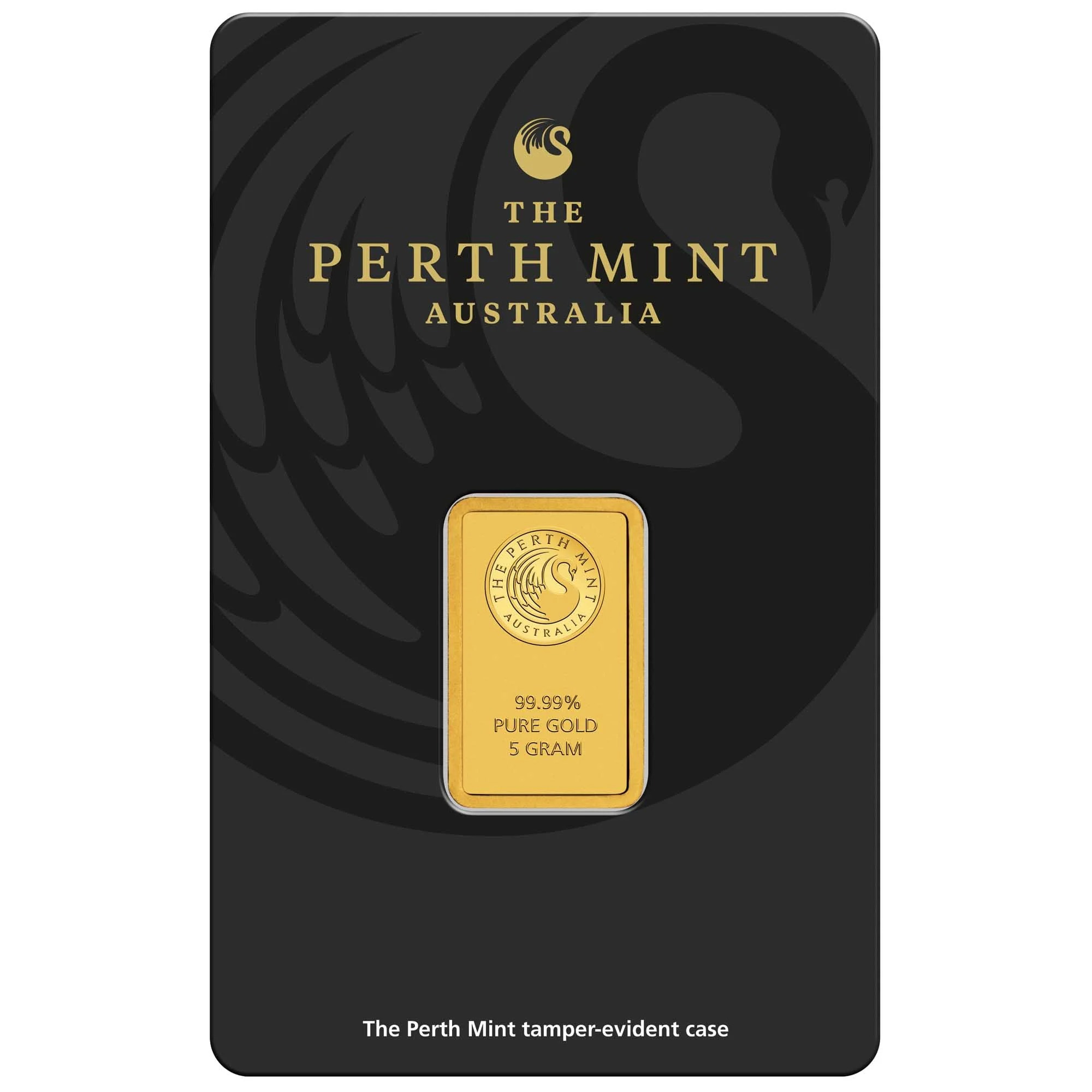 Cada barra acuñada viene en un envase a prueba de manipulaciones que muestra la palabra VOID alrededor del borde del blíster si la tarjeta ha sido forzada para abrirse. La tarjeta es de color carbón con una imagen oscura, similar a una marca de agua, del logotipo estilizado del cisne de la Casa de la Moneda.